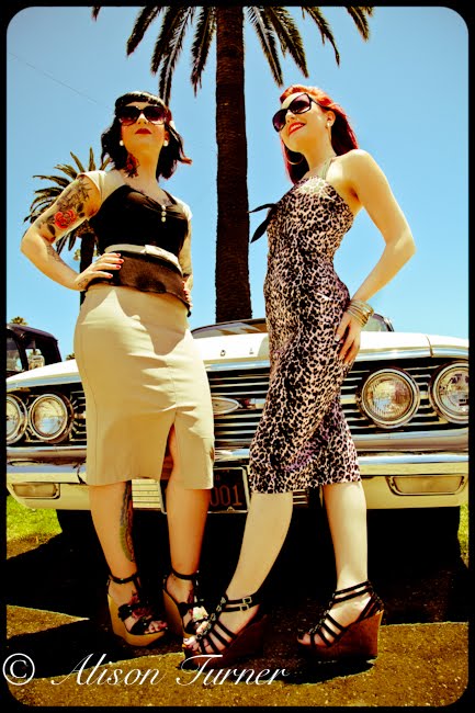 As soon as I walked in the gate, there were pin up contestants walking around with their number on a stick and even the "non contestants" were dressed perfectly. I am not one to walk up and introduce myself right away since I am a little shy, but I did and asked these women to pose for me. I didn't know them or anything about them but instantly I had visions of the beautiful varga pin up models and asked them to do a few poses for me. Their hair and make up were perfectly put together and it's fitting since they are both stylists of pin up and hair design. I imagined them constantly checking to see if their lipstick was perfect (this coming from someone who doesn't wear make up) so I asked them to look in the car mirror to check. They both glanced in the mirror and I snapped this picture.